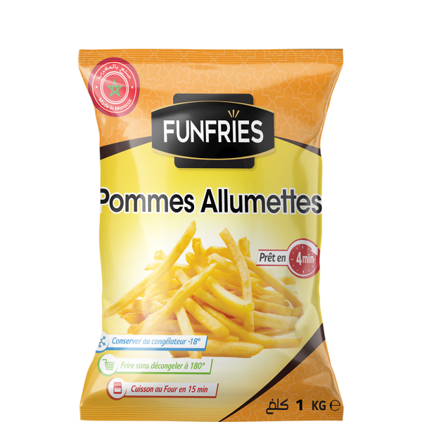 Nos frites Allumettes sont confectionnées avec les ingrédients de la plus haute qualité pour garantir qu’elles sont toujours croustillantes et savoureuses. Nos frites Allumettes FUNFRIES peuvent être appréciées en tant qu’accompagnement ou en tant que collation passagere , et peuvent être accompagnées par différentes sauces pour répondre aux goûts de chacun.