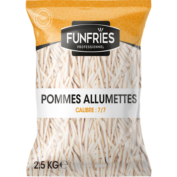 Nos frites Allumettes sont fabriquées à partir de pommes de terre fraîches de haute qualité soigneusement sélectionnées pour leur saveur et leur texture. Dégustées seules ou en accompagnement, nos frites satisferont à coup sûr les envies de vos clients. Elles sont faciles à préparer et peuvent être servies chaudes en quelques minutes. Avec nos frites Allumettes, vous pouvez offrir à vos clients un accompagnement de plat classique et satisfaisant qui est toujours sollicité.